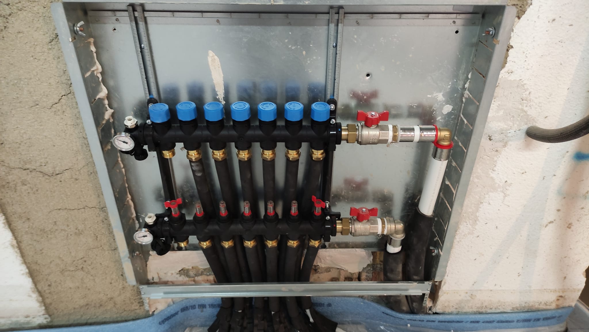 Para conseguir la climatización completa sin refrigeración por aire, realizamos la instalación de suelo radiante y refrescante de la marca UPONOR, para climatización con hasta 20 circuitos hidráulicos para vivienda de 197 m2. Este dispositivo está compuesto de 20 cabezales electrónicos para control de zonas, panel aislante UPONOR KLETT AUTOFIJACION PANEL NEOROL de varios espesores, tuberías de polietileno reticulado, banda perimetral, elementos de fijación y montaje, colectores UPONOR VARIO M con caudalímetro, y con sus correspondientes detentores, purgadores, llaves de vaciado y llenado de los circuitos, válvulas de corte, sistemas de soporte y anclaje, también de la marca UPONOR.